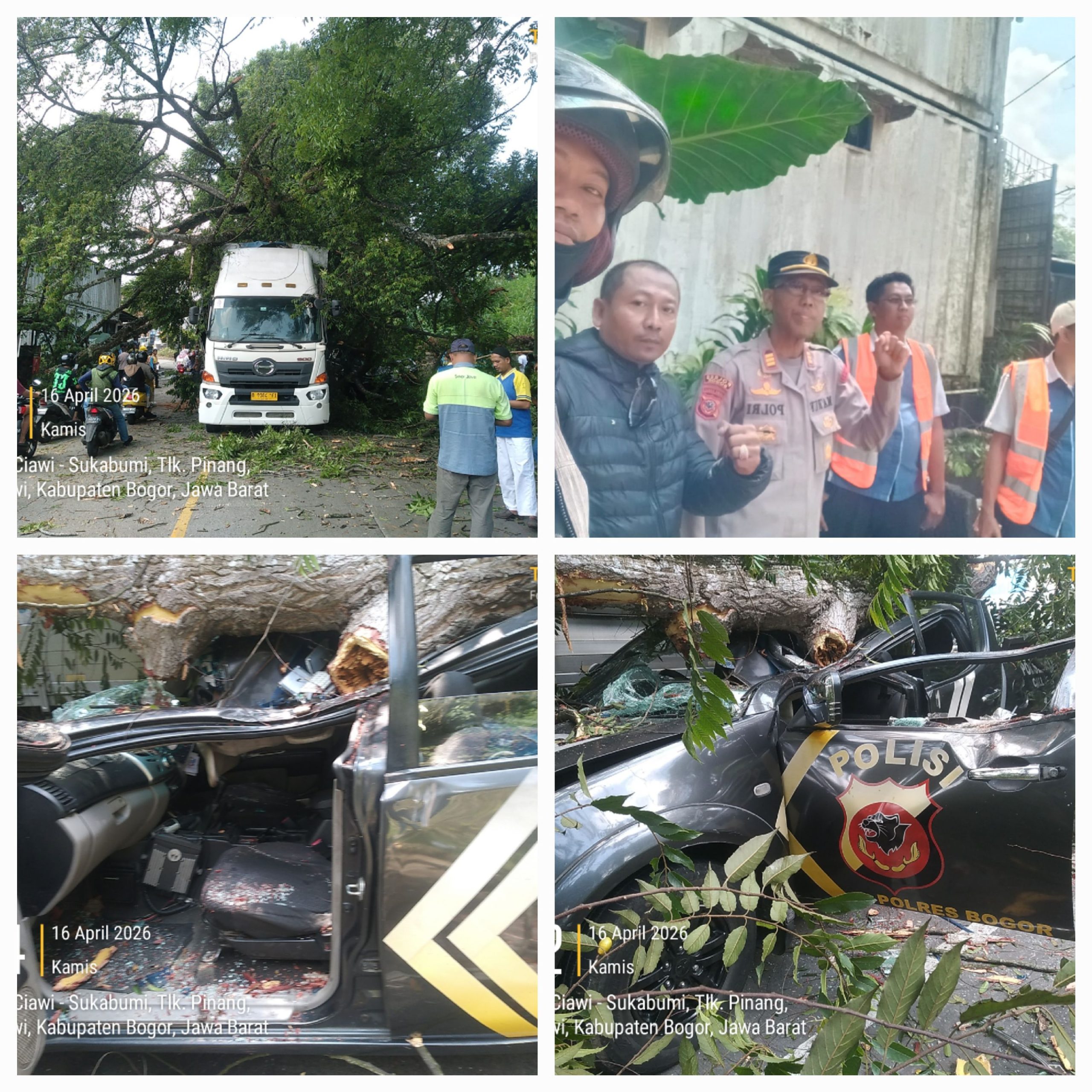 Garudanewss com Bogor, Kamis (16/4/2026) — Peristiwa pohon tumbang yang mengakibatkan kecelakaan lalu lintas terjadi di Jalan Raya Ciawi–Sukabumi, tepatnya di kawasan Teluk Pinang, Kecamatan Ciawi, Kabupaten Bogor, pada Kamis siang sekitar pukul 11.11 WIB.